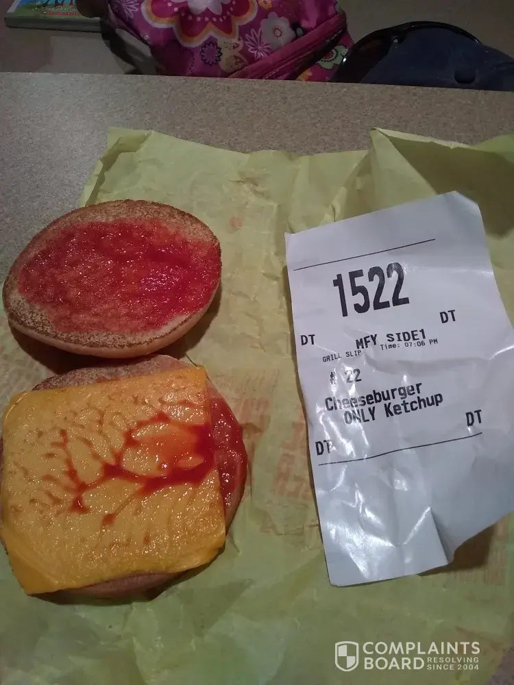 Last night after a long night of games we went to Parsons Kansas McDonald's to get supper. We don't get to eat out very often and I have never complained about our food before. But last night I ordered 2 cheeseburger large meals with ketchup only on the burgers and it came out with no meat on the burgers. It was a $23 meal and when I got home I had to make dinner anyways because there was only bread, cheese and ketchup. On meat.