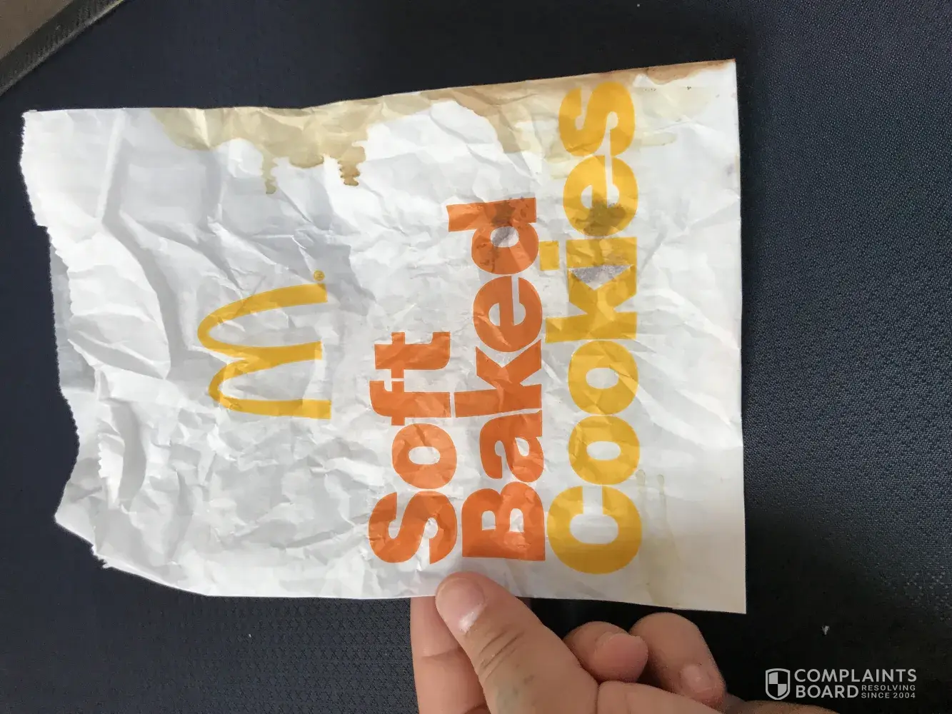 I was ordering via drive through. I wasn't paying attention the bag I was handed with the cookie inside, I thought nothing of it. I set it down on the seat next to me and drove home. When I finally sat down to eat it the bag was stained with what looks like coffee and the bag is all crinkled up...my cookie tasted weird and stale and I was not pleased with this.