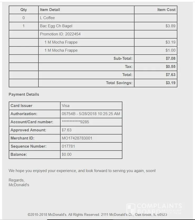I went to the McDonalds at 2401 63rd street on May 28th and placed an order on the mobile app using the Buy One Mccafe beverage, get one free. I never received a paper receipt and was told to pull to the second window where I received my two Mocha frappe's. Later in the day I checked my digital receipt in my email and saw I was charged for a bacon, egg, and cheese bagel which I never ordered. When I called and talked with the manager I was told I had to have a paper receipt in order to be reimbursed or else he couldn't help. So I was hoping to somehow be reimbursed using this email receipt that I will attach. Thank you for your time.