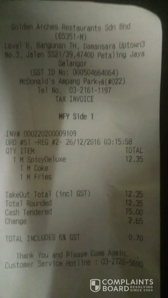 I am very disappointed with the service provided by McDonald's Ampang Park. I ordered Spicy Chicken McDeluxe and they gave me Double Cheese Burger. Unfortunately. I already home when I notice that.