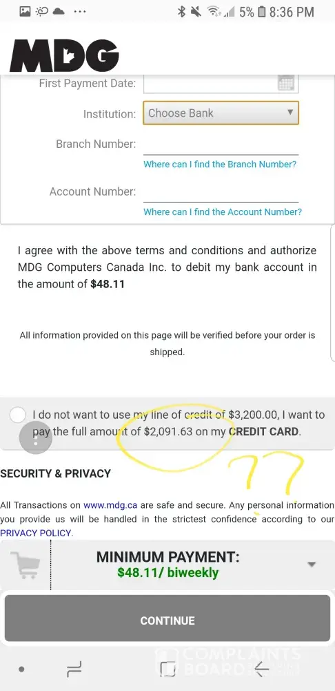 I figure what the hell I have a 2070.00 credit limit. I look at the paper work they want to me sign and my total for the laptop is $2069.97