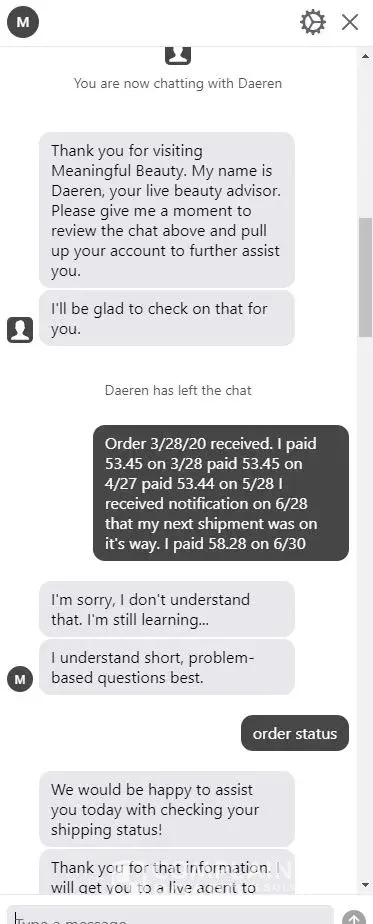 i ordered meaningful beauty back in the spring, a month later was charged again unaware i would be sent another automatically, i called customer service to cancel membership and talked with a guy named Sam, he told me they would return my