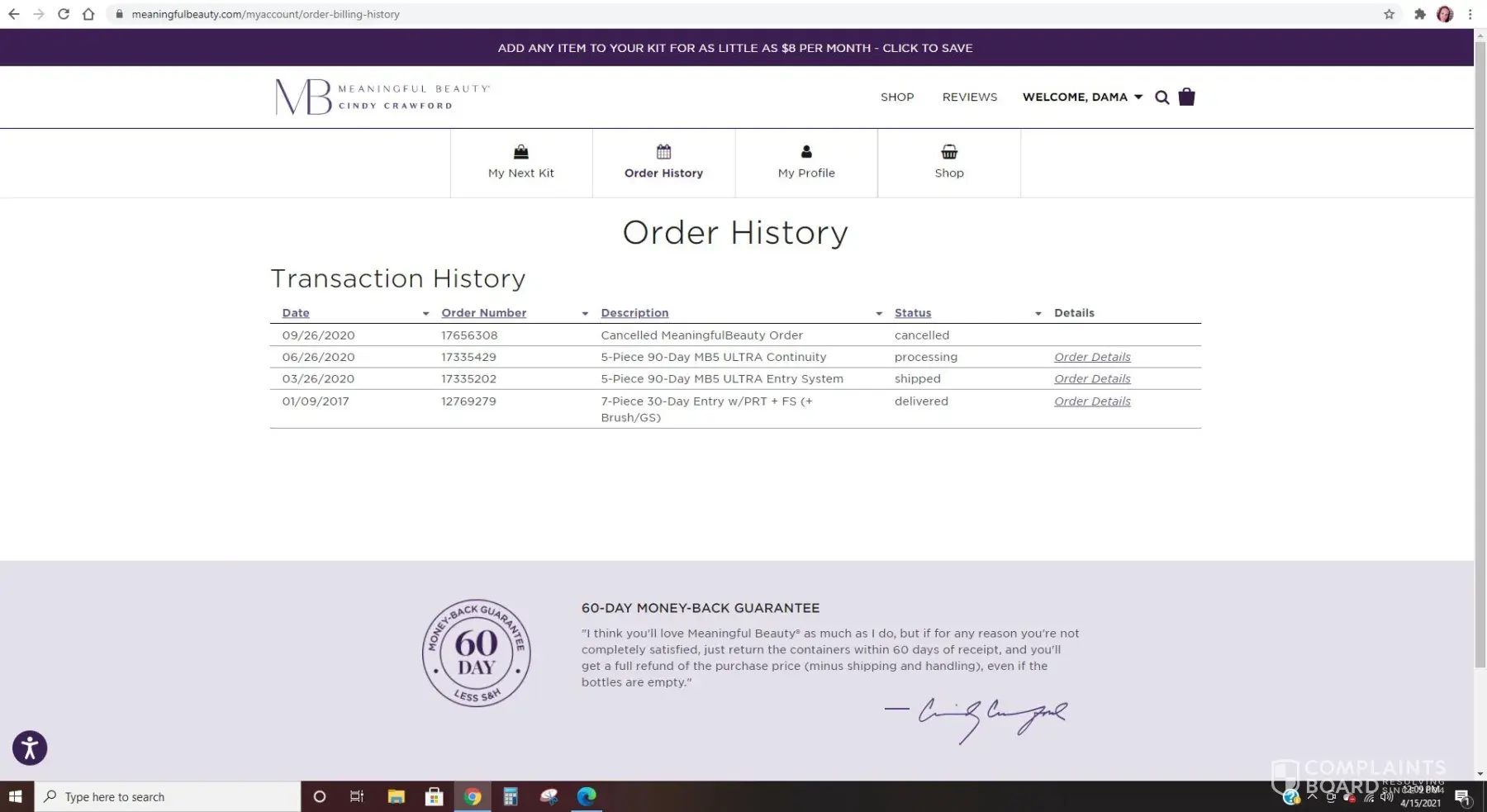 A most disreputable company... Cindy Crawford should be class-action sued ... I ordered a trial of several lotions for approx. $60. The next thing I know, my credit card is charged an additional $80.88 and a "membership" package is being sent, which I NEVER AUTHORIZED. It took me TWO MONTHS to get that amount credited back. They first wanted me to PAY to return it. Then when it got the merchandise back, the company deducted $20 for the return label! A helpful customer service rep finally credited that amount back, but I had to stress over the situation for weeks on end. In brief, Meaningful Beauty (what a joke for a name) earned interest on MY MONEY while pretending I ordered a membership of these useless products. The best thing about them is the packaging, which is basically what you pay for because you get very little of some very questionable lotions. Avoid this company at all costs (and I mean COSTS)!