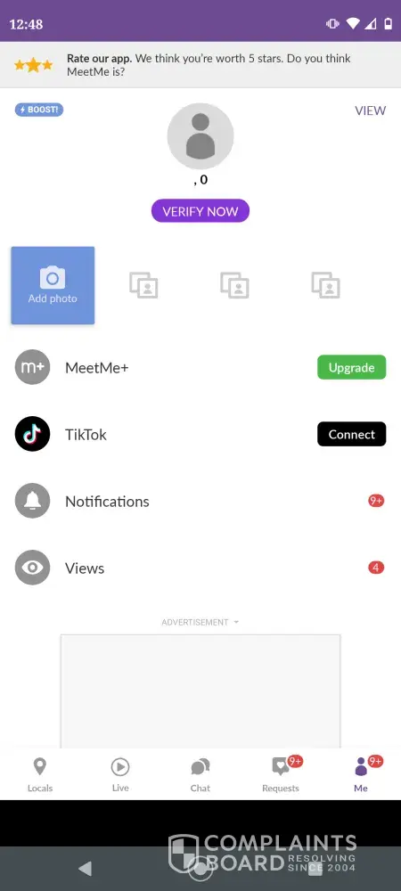 MeetMe tried to minimize the number of fake profiles by randomly flagging new accounts for "verification" via text message, but nothing changed.