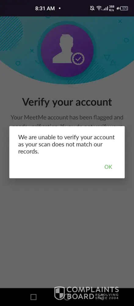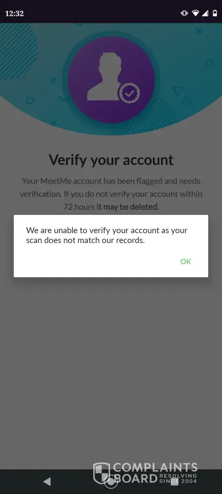 I e-mailed MeetMe Support and they manually verified my account and asked me to sign in again. I did so (using the desktop website) and guess what? Same "Verify your account - Download MeetMe" message. I let them know it's asking to verify again and they manually verified my account a second time. I went straight into the app and deleted my account ASAP.