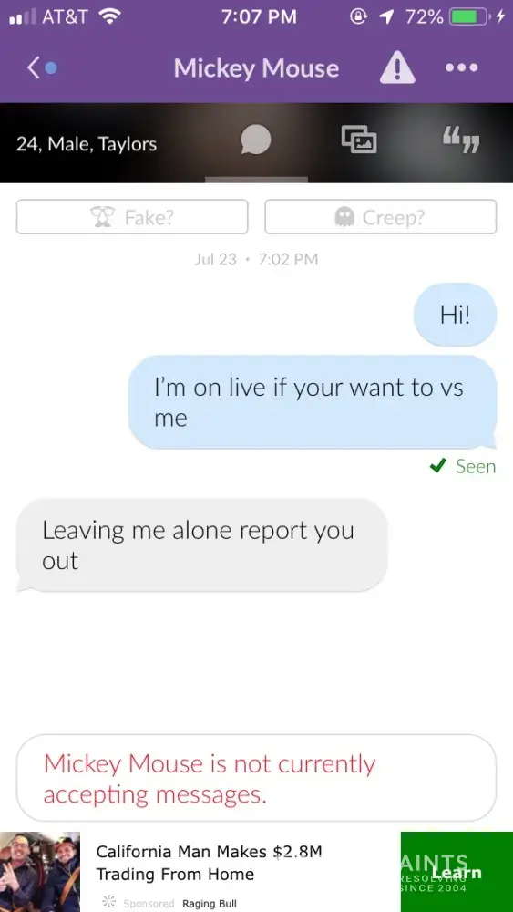 I'm not happy withthe people on this app for being rude to me for no reason some one by the name of mickey mouse and when i'm streaming on live the viewers are quiet for some reason i'm not sure why and this all happened on the meet me app and yes I did block this person and I also reported this person and I emailed meet me about this and I hope something is done about this