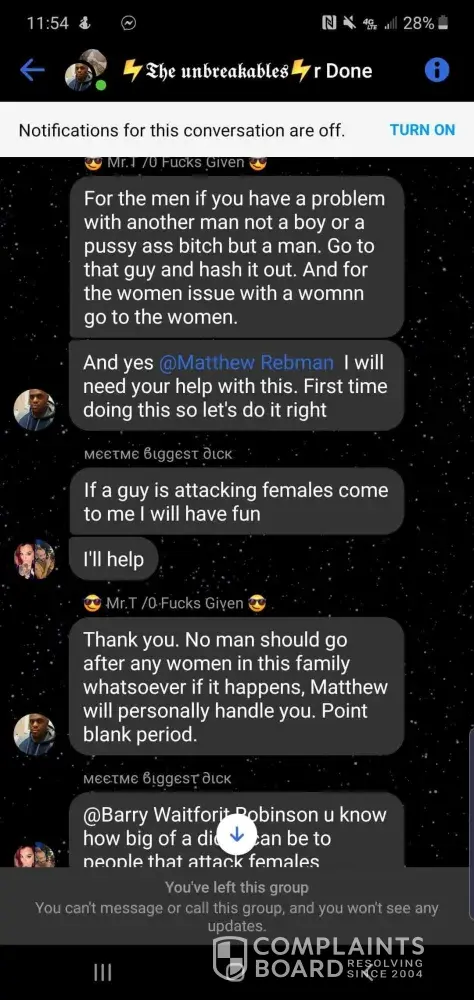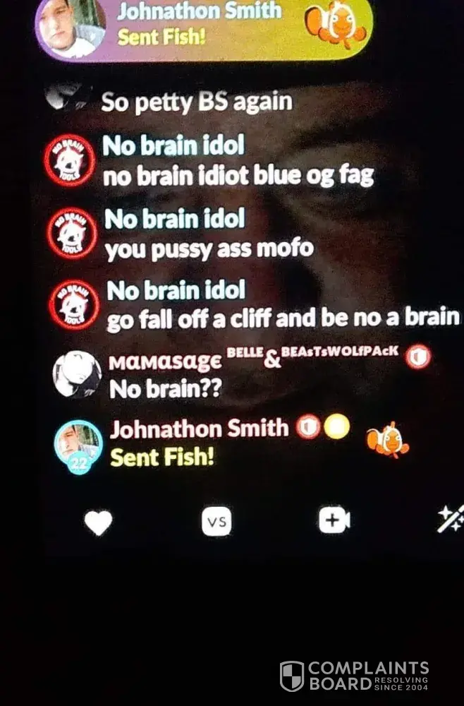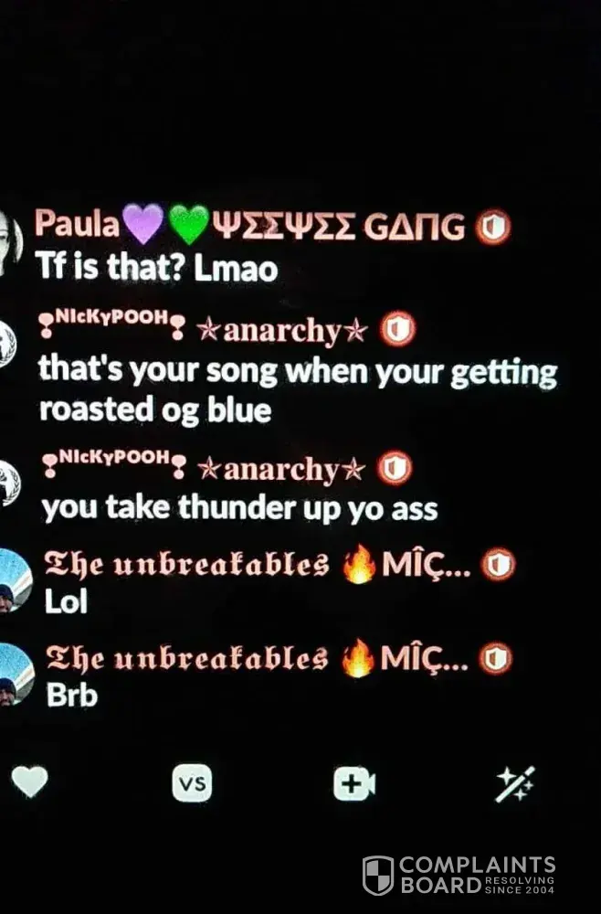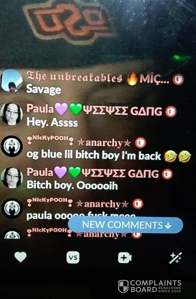 I am filing a complaint against the people on your site they are bullying people they are harassing people they are threatening to hurt people you seriously need to do something about it you need to go on there and you need to shut these people's down I know that their users name is one of them is Papa ghost heckles Yoda Jason lurch clown monster which Queen classy b**** whiskey all these people are on their bullying other people my son deleted his app and they're still harassing him through his phone and I have a lot more if y'all want to see them