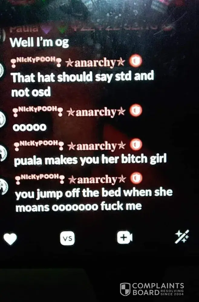 You have people on here bullying people threatening people plastering personal information out there their names is Yoda heckles Jason classy b**** whiskey Queen monster lurch clown all these people are harassing and they are threatening people they are getting into people's facebooks they're getting into people's personal and they're putting pictures that's not them up there to get into this stuff me to shut this stuff down now
