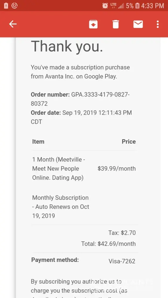 I had took a free subscription of Meetville last week and I had deleted the account next day. On 7th of July, I got a sms that Rs.3500/- have been deducted from my RBL BMk Credit Card limkedvto my google play store using my email [protected]@gmail.com. I couldn't understand that even after deleting my account why my Subscription was activated. Please look towards the matter.