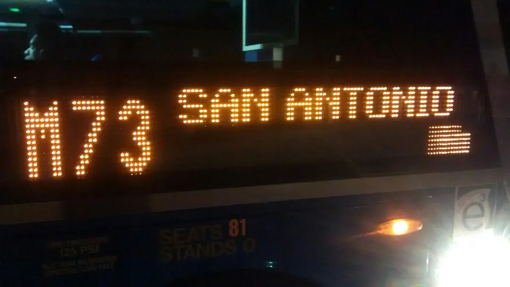 DID NOT DEPART SAN ANTONIO UNTIL 6:30pm on a white charter bus. ARRIVED DOWNTOWN HOUSTON AT 11:01 pm