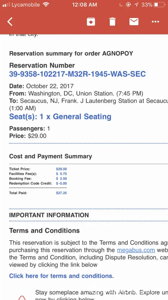 I bought two tickets at megabus.com for the Oct 6 2017 11:59pm bus from NYC to Syracuse NY. I did this on my cellphone and texted the registration number to my travel partner so we'd both have it. When we went to the bus the next evening the driver said this registration number isn't for this bus but for one which left at 12:15pm today. I said that isn't what I bought. He said call customer service. I did. They didn't answer just the same recording again and again... that they were experiencing high call volume (at midnight?). I waited for 45 minutes listening to the same recording repeat. Is it possible there is no service at night?