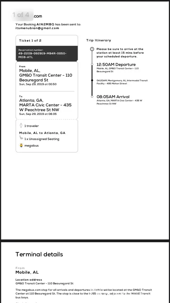 I Leslie C Boomer purchused two tickets from Mobile Al to Alanta Ga. Ticket #[protected]-M94R-0050-mob-atl