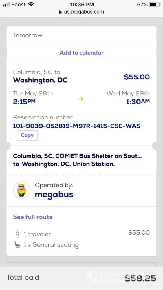 I left from Columbia Sc, Going to Washington D.C...the bus was supposed to leave at. 2:15 p.m. it didn't arrive for another 30 mins... Then bus pulled over about 3 times... The Bathroom was disgusting and smelled horrible..im suppose to arrive at my destination at 1:30 a.m. but now its more like 3 extra hours late...we were supposed to switch drivers in Raleigh but that turned into another hour...i have never been this dissatisfied and disappointed ...this whole top part of the bus has been complaining because this is ridiculous😡😡😡