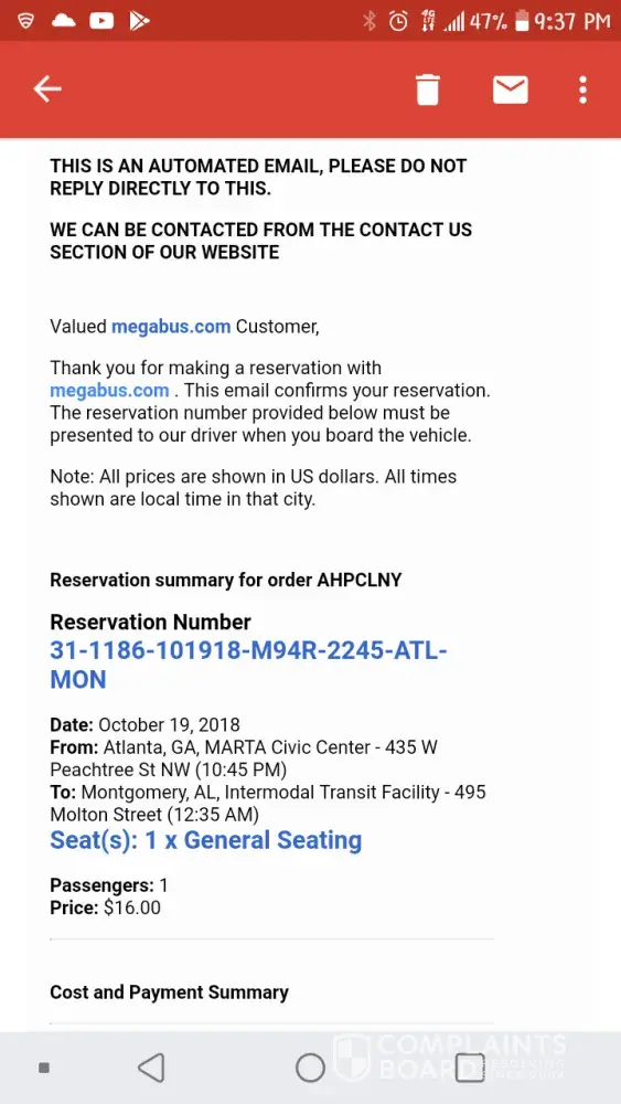 purchase a ticket to board a megabus and the scheduled but did not arrive