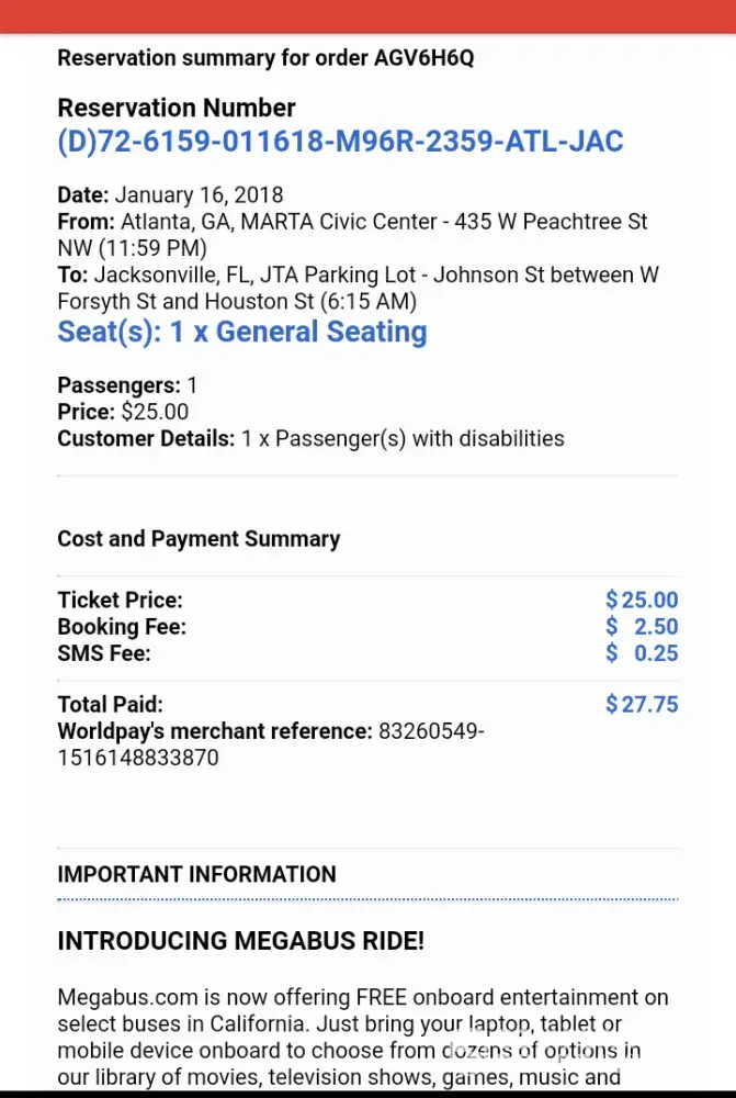 Here's the issue: My mother is elderly, does not speak English, and requires frequent medication for health issues. The other woman who was left stranded was Nigerian and spoke limited English. My mother carried her bag with her into the store (thank goodness), however the other woman did not have any belongings. My mother had her cell phone and was able to call me as soon as it happened, but she didn't know where she was at, and neither did I as this store/ gas station is not an indicated stop on the ticket. A random bystander felt terrible for these women, and volunteered to drive them to Richmond to the bus stop to try and meet the bus as it stopped to load additional passengers. I interpreted the entire way with this stranger and my mother. Nearly 30 minutes later, they arrived (with the help of GPS) to Richmond, VA - The Plaza at Main Street Station where the ticket indicates the bus will stop. However, this location is under construction and there is no bus stop at the indicated address. No one knew where to go, and I could not get through to Megabus on the phone due to "high call volume". The stranger driver had to leave, and dropped my mother and the other woman off at a Buffalo Wild Wings in Richmond. From the Buffalo Wild Wings, I ordered the ladies a Lyft ($135 charge) to transport them to Union Station in DC where I awaited them. The Nigerian passenger was able to locate her bags at that time and actually saw the driver, who acted like he couldn't be bothered and never apologized.