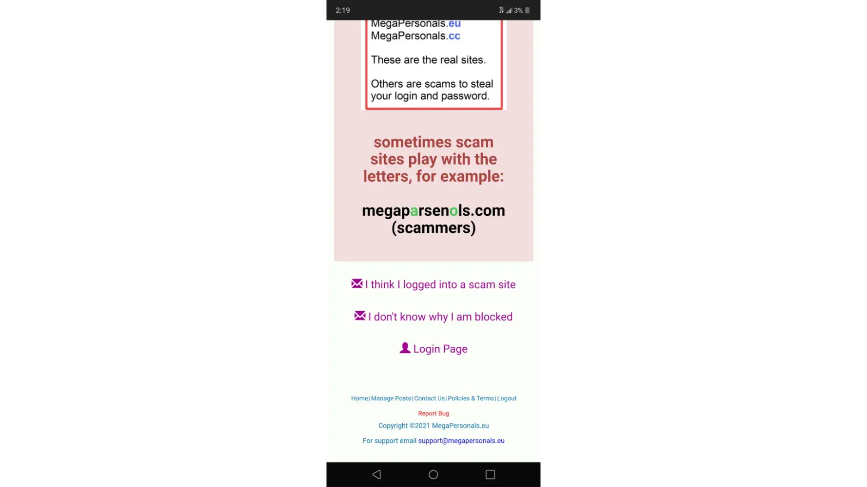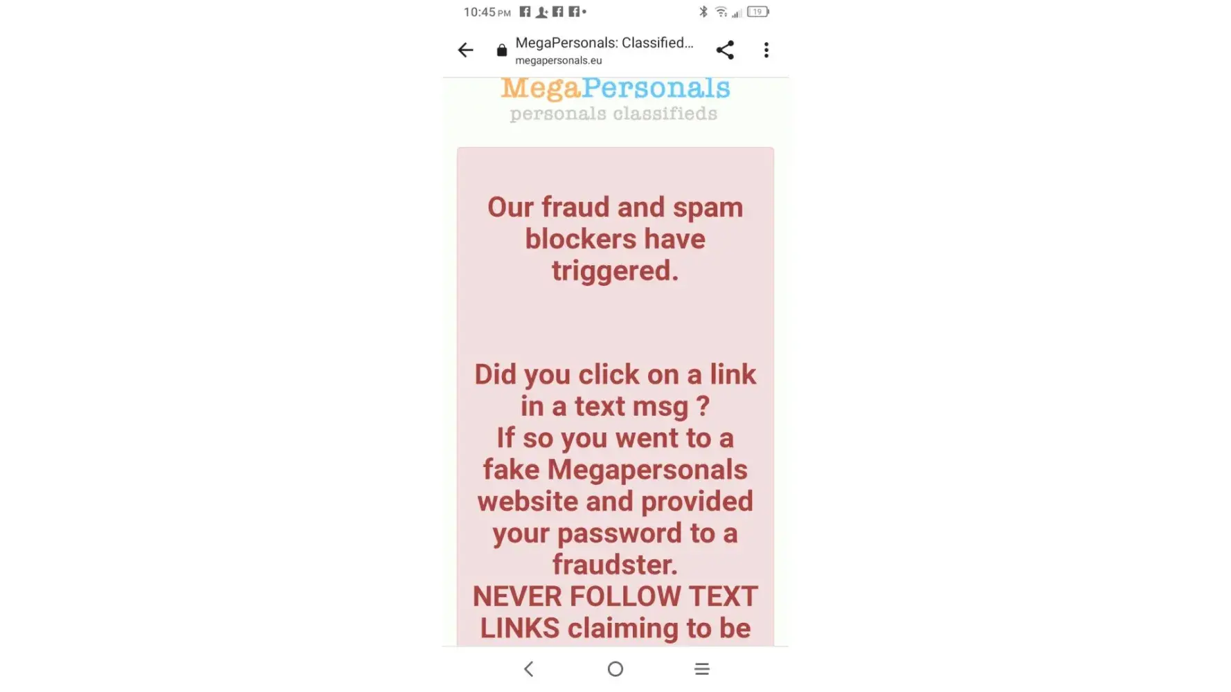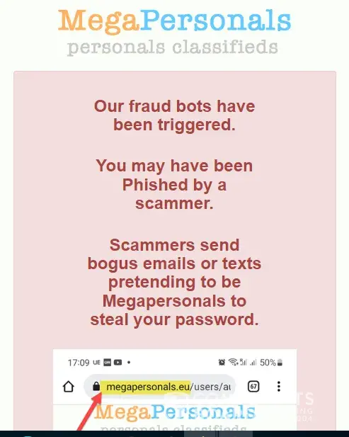 TO EVERYONE WHO POSTS ON MEGAPERSONALS.EU IF U EVER RECIEVE ANY TYPE OF MESSAGE CLAIMING TO ME FROM THE WEBSITE U ARE POSTING ON DO NOT CLICK ON THE LINK! IF U READ THE DISCLAIMER ON THE WEBSITE U WILL SEE THEY STATE THEY NEVER SEND TXT MESSAGES AND WILL NEVER ASK U TO CLICK A LINK AND GO TO A DIFFERENT WEBSITE TO "VERIFY" YOURSELF NO MATTER WHAT THE MESSAGE SAYS WHETER IT'S "UR ACCOUNT IS GOING TO BE DISABLED CLICK THIS LINK TO VERIFY" OTHER ONES GO SOMETHING LIKE THIS "This is megapersonals.EU we are moving our site to a different website here's the new website click the link and sign in OR MY PERSONAL FAVORITE... They pretend to be an inquirer and everything seems normal then all of a sudden they will say "prove u are real or legit click this link go to this website and sign in to verify urself! NEVER EVER EVER FALL FOR THIS ALL OF THESE ARE SCAMS AND MANY MORE THEY GET PRETTY CREATIVE SOMETIMES AND CAN SEEM PROFESSIONAL DO NOT MAKE IT EASY FOR THEM DO NOT EVER CLICK ANY LINKS SENT TO UR PHONE VIA TEXT FROM ANYONE ASKING U TO GO TO ANOTHER SITE AND LOG INTO UR ACCOUNT! THAT IS HOW THEY STEAL UR INFO AND UR ACCOUNT! WHICH LETS KEEP IT REAL IS STEALING UR MONEY!💰 I have been lucky enough not to be a victim of this heinous CRIME because I have been a victim of other fraudulent activity and scams so now I am overly cautious so when I saw that txt message this one was claiming that my account was disabled not counting on the fact that I would go onto the actual website to verify this info and lo and behold I could sign on just fine then I read the DISCLAIMER on the REAL website and found out that they NEVER send text messages to their users EVER PERIOD! and explicitly warn us not to click any links these are all SCAMS! So I've made it my mission and priority to inform as many men and women about this! In fact whenever I get a group txt scammer I always warn everyone else in the group that it is a scam and don't be a fool! Or victim don't let them win! They are the lowest of the low scumbags of the world! I still receive these type of texts all the time and it is very annoying but when I feel like texting back I tell them right where they can stick it and cuss them out and tell them they should be ashamed of themselves and etc. Etc. Even though I know it won't stop them it makes me feel better to get it out and of course I block them but let's face it they have endless phone numbers@ their disposal many are from other countries around the world! Its as if they are watching and waiting for me to post because shortly or sometimes right after I do here comes the text messages and there's always a few somedays I wake up to these messages and I tell them I know they are a scammer and I know what they want and I will kinda tease them and say u want my account info so bad don't u that's why u never give up but guess what U might as well stop trying me because u are wasting ur time U will NEVER EVER get my account info or any personal info from me I am not new to the [censored] give it a rest and leave people alone and go get a REAL. [censored]ING JOB! Anyway just wanted to share that because I read a complaint about a poor woman who without thinking clicked on the link and typed in her email and password and I was like NOOOO! U DIDN'T! I truly thought by now everyone knew about this SCAM! but when I read what she went through it really upsetted me so I decided to write this so that it NEVER happened to anyone again! Also these aren't the only scams their are many more so just be careful and think before u click think before u open a sketchy email hint: all the emails claiming u won some sort of prize are SCAMS! First of all to win a prize u have to enter and secondly if it was legit they would maybe send an email but definitely CALL u as well! Please I know from experience it is so tempting especially because these emails seem to come when u really need the money the most but I have clicked on one before and luckily didn't have my info stolen but the email said in huge letters WINNER! So naturally I was like SWEET! I wonder what I won and opened it this to another page where I was told to fill out a "quick" survey this went on for a while then I was like let me read the small print that almost no one reads by the way because its teeny tiny on purpose so I read it and without making this story super long they had different levels silver, gold, and platinum and they all required a purchase I laughed at myself for spending probably an hr maybe 2 trying to complete this stupid survey only to find out in the end they would want my credit card info which of course I did not give them so there are lots of different types of internet, texts, email, even phone sometimes someone will call u claiming to be from SSI or something saying someone commited a crime and used ur info or u havent paid this or that sound familiar this happened to me and why I fell for it is because the woman sounded very professional, she scared the crap out of me saying the police were after me for something I don't remember and because I was frantic and not thinking rationally I told her my Social sec number she gave me a phony claim # and everything then asked me if I had ever been to Texas and at this point I was crying my eyes out I responded NO! And CLICK! Was all I heard I immediately realized that was a scam call and had I been thinking rationally I would have remembered SSI NEVER calls YOU! U HAVE TO CALL THEM AND IT TAKES FOREVER TO GET THROUGH TO ANYONE! They Will send a letter in the mail... So at this point I start freaking out worrying that my identity had been stolen and I filed a police report I was so embarrassed for falling for the oldest trick in the book but he told me it happens all the time and they scare u intentionally so ur not thinking straight so for the next year I paid close attention to my bank statements and activity I let my bank and social security know so they could keep an eye out for suspicious a