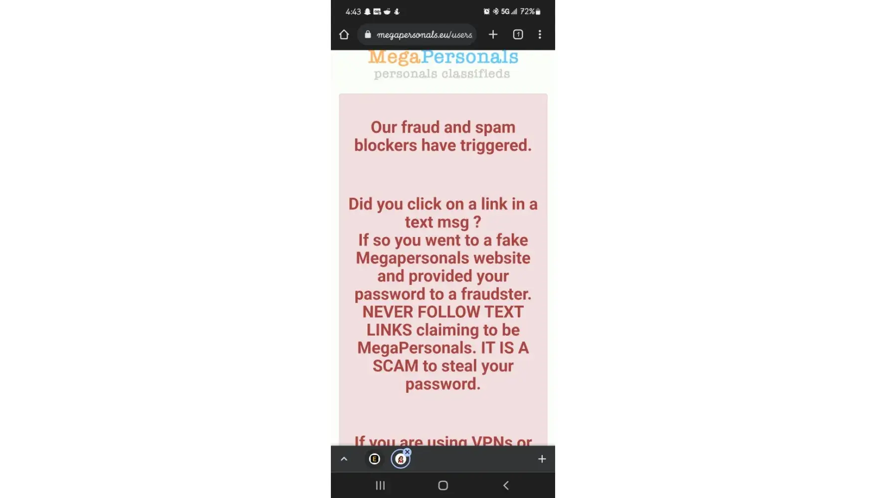 Hello my name is Ms. Eclipse [protected] and I've been posting on Mega personal for years and never had an issue until a month ago since the last time I was able to get into my account, I was asked to do a series of things to verify myself which I did, then I was told there was no issue with my account on there end I needed to send my email and email password so they can verify my email I thought it was odd so I didn't, but I was told that was going to be the last response they were going to send me; and it has a month later my ads are still posted on megapersonals under January 7th 2022 but my account is flagged it does not make since can it be fixed please thank youÂ