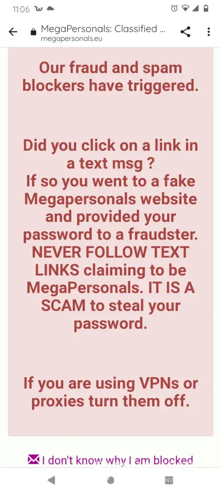 Falsely blocked. B4 I meet with ppl I screen them and verify them. I was contacted by a person and I asked them to verify and asked them my screening questions and they got all hostile and told them When I asked other ppl my screening questions They don't hesitate to tell me what they are. but he had an issue with it. So I told him well I don't feel comfortable with meeting you have a good night sir and hung up the phone not even two minutes later I'm bumping up my ad, And then the screen pops up with " Our fraud and spam