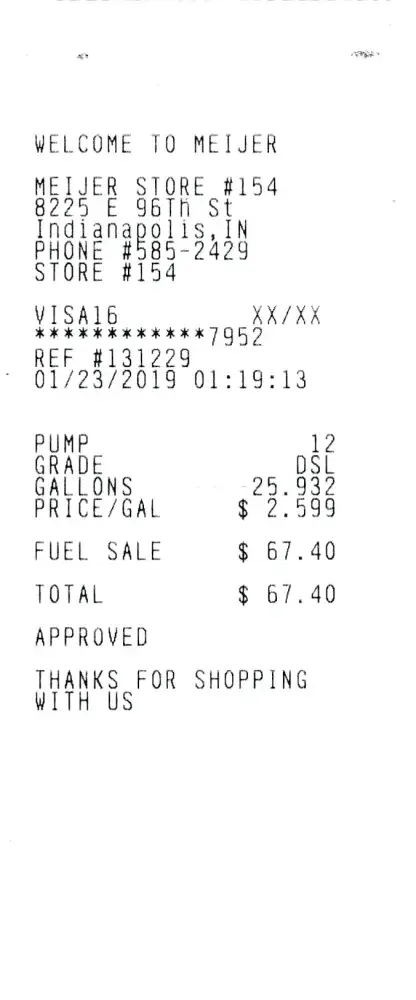 I arrived on 1-23-19 at the Meijer fuel station #154 on 8225 E. 96th Street, Indpls, IN 317-585-2429 at 1:19 pm. Price of Diesel on this day was 2.599 per gallon. I went to the Diesel pump to fuel up. I was on pump #12. My truck says I should be getting 19.3 gallons of fuel. I figure that that number might be a little off by a half gallon or so. So I filled...