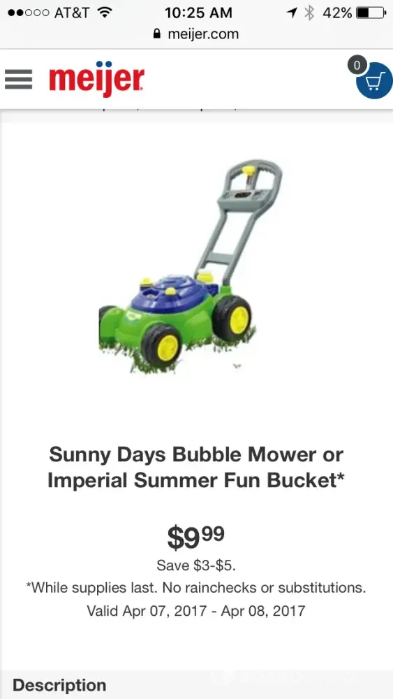 Went to to my neighborhood meijer to purchase an item in their ad for the two day sale...they don't even have the item advertised...sunny days bubble mower. Why are you advertising something that isn't even there and you can't order it online..I'm very upset as these were easter gifts. Do you just do this to get people in the store. I'm sure I'm not the only person looking for this product
