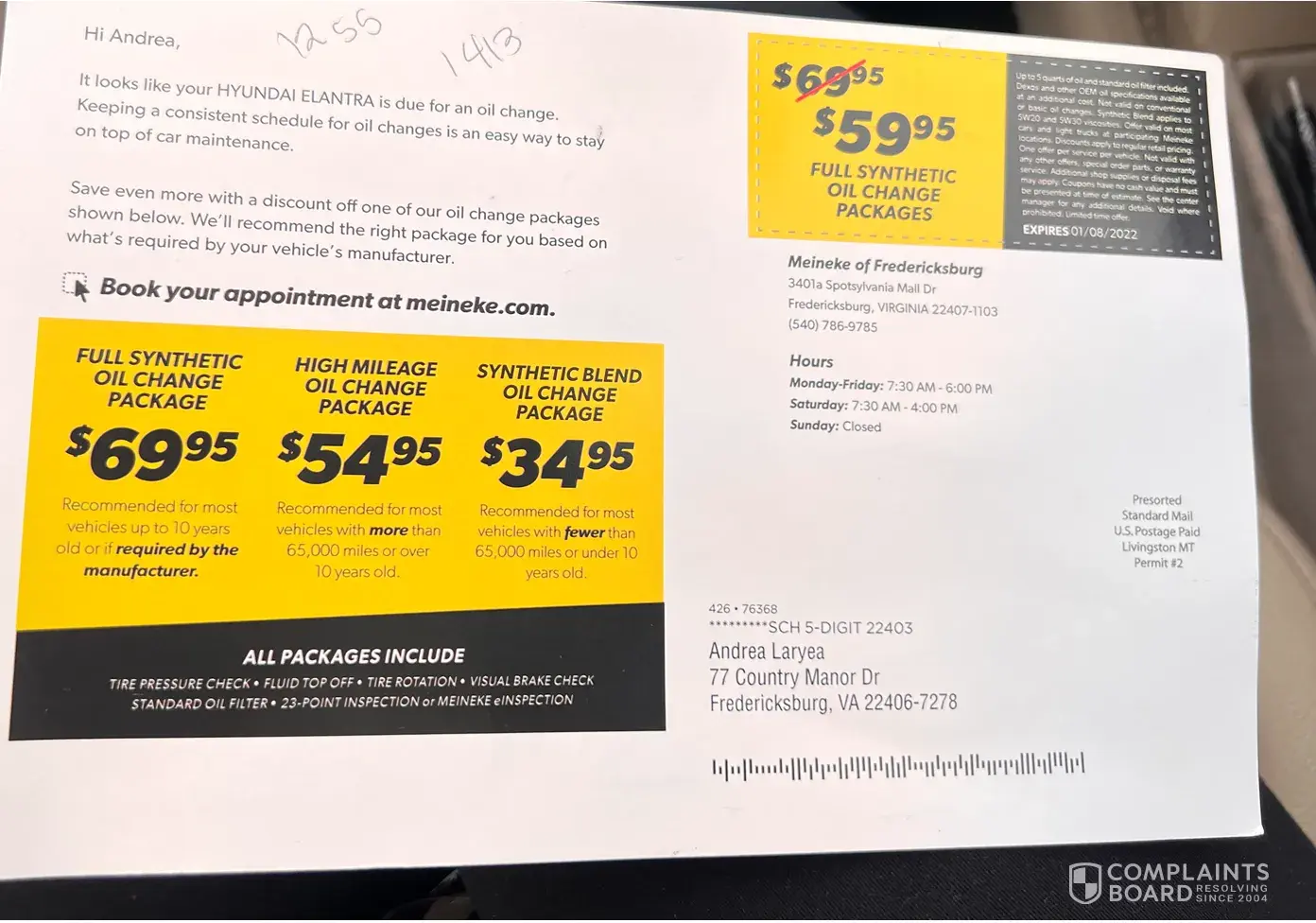 I called Ron at the Meineke, 3401A Spotsylvania Mall Dr, Fredericksburg, VA, United States location on January 2, 2023. I told him I wanted to bring my vehicle in that day. He said he did not have any appointments left so I asked if I could bring it in the following day January 3, 2023. I told him I would get my son to bring it by. When my son and husband (husband decided to get his done as well) came in. My son provided Ron (same guy I spoke to the night before) with a Meineke coupon for a full synthetic oil change. Ron then tells him he will not honor the coupon. My son calls me since I made the appointment. He tells me the issue. I speak to Ron and ask him why he will not honor the coupon since it was written with his store location. He stated that corporate puts those out, but it is up to the location to decide if they will honor the coupon or not, and he will not honor it. He said the most I can do is give you $5 off. I told him that was false advertising. I asked him the total with the $5 off and he told me 125$. The coupon was for a full synthetic for $59.95. My son and husband ended up leaving and going elsewhere.