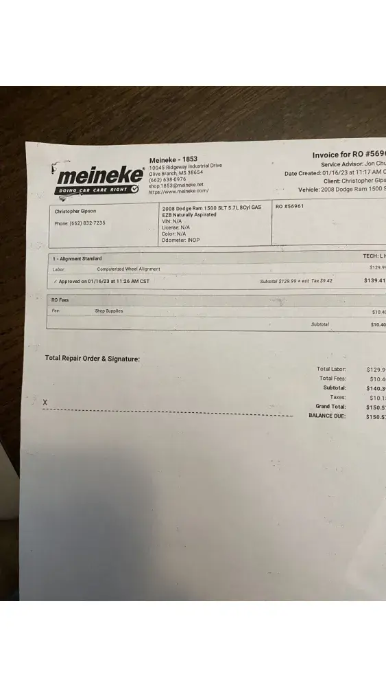 On Monday January 16,2023 I took my 2008 dodge ram in for a front end alignment because my truck was pulling to the driver side. That afternoon I was advised that my trucked was ready for pick up, my wife and my daughter picked it up and as my daughter was driving my truck away from Meineke she called to tell me that the steering wheel was cocked to the right and not centered and upright as it should and was now pulling to the passenger side. I took my truck back in 4 days after it was serviced. I took my truck back in on Saturday to get this problem fixed and the service advisor instantly attempted to some how make this my fault and proceeded to tell me that front end alignments are not covered under warranty but the Meineke limited warranty sheet I was given with my itemized receipt paragraph 5 Additional parts and services states that all other parts and services itemized on your receipt are warranted for a period of 12 months or 12,000 miles or which ever comes first. I was also turned away because there were 10 cars ahead of me customers whom had not paid for their service yet and was told to bring my truck in Monday January 23,2023 and he would looked into it. I want this problem fixed because I purchased 4 new tires the Sunday prior to taking my truck there for service.