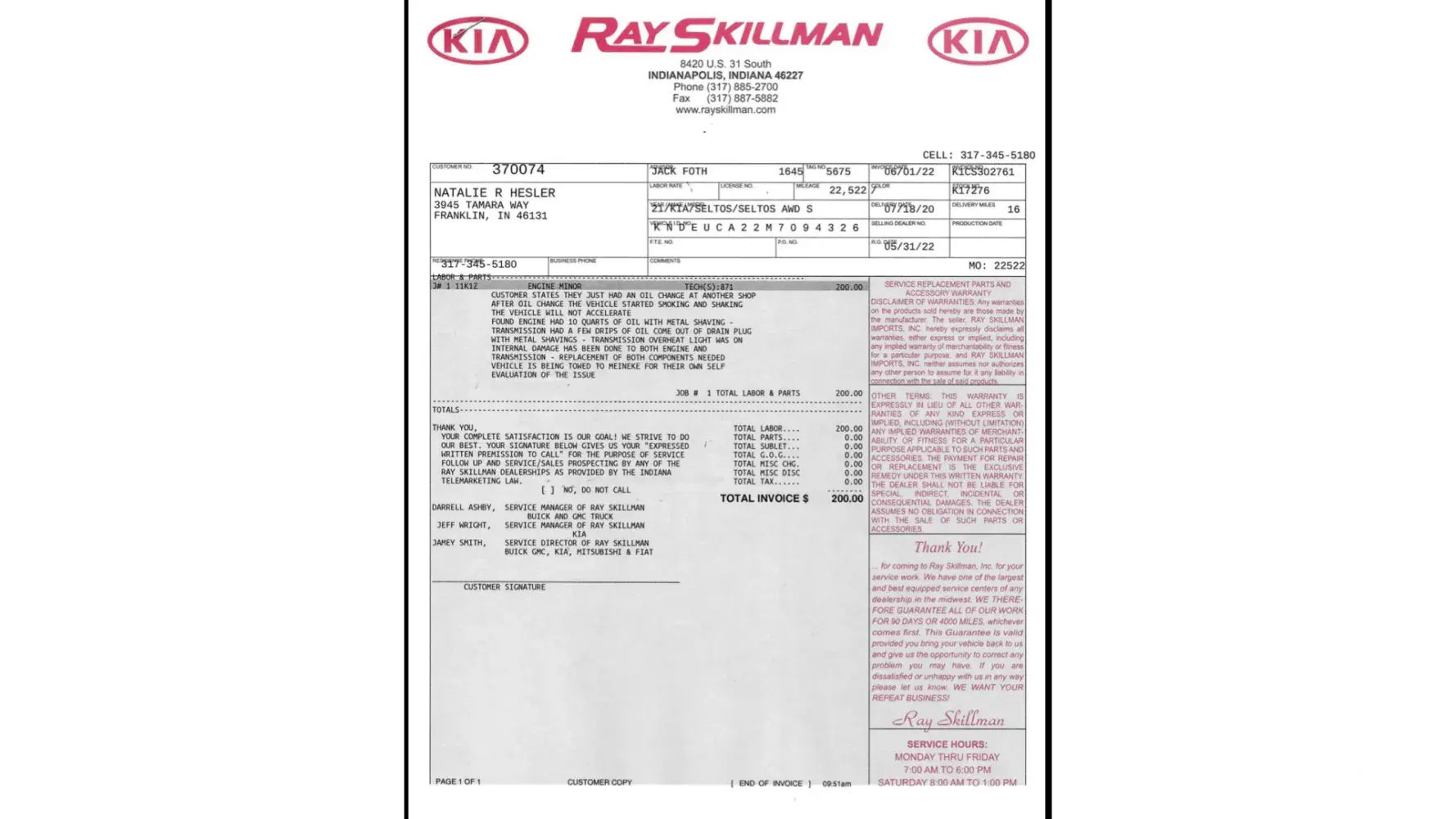 My wife took her 2021 Kia Seltos in to the Franklin, Indiana location, on 990 N. Morton Street, for a routine oil change this past Saturday... The very next day the transmission started overheating, the engine started shaking, the exhaust started smoking, and the vehicle was no longer responsive to acceleration. We were left stranded for hours before we had to get it towed to Ray Skillman Kia (where we purchased it months before). Upon them diagnosing the vehicle, they found that meineke had not drained the oil, instead they drained out all of the transmission fluid and just put new oil on top of the old oil that was already in there... They found 10 quarts of oil in the crankcase! It has caused an estimated $17,000 worth of damage to a car that barely has 20,000 miles on it... My attorney and insurance is now involved, but we'll see how it all turns out, since the owner, Tim, at the Franklin meineke is denying any wrongdoing and is refusing to help... Whom, by the way was extremely rude and vulgar. I definitely wouldn't want someone with those kind of customer service skills representing my company. We have already contacted the attorney general, will be pursuing legal action, and plan on letting everyone know that we can about the experience and lack of accountability, or even a single bit of remorse.