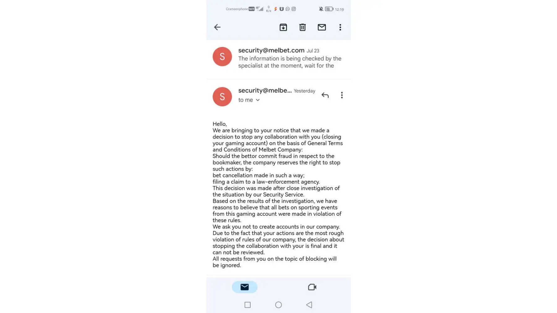 User ID: [protected] Melbet is a big scammer. They blocked My ID with, 11000+ BDT. After giving all proper documents. Security team of melbet. This email team didn’t reply my mail anymore. I Emailed them more than 15 times. 2 months gone but no response. I want to complain Casino license Authority. I want to inform them about their cheating. Please give me any contact details of them