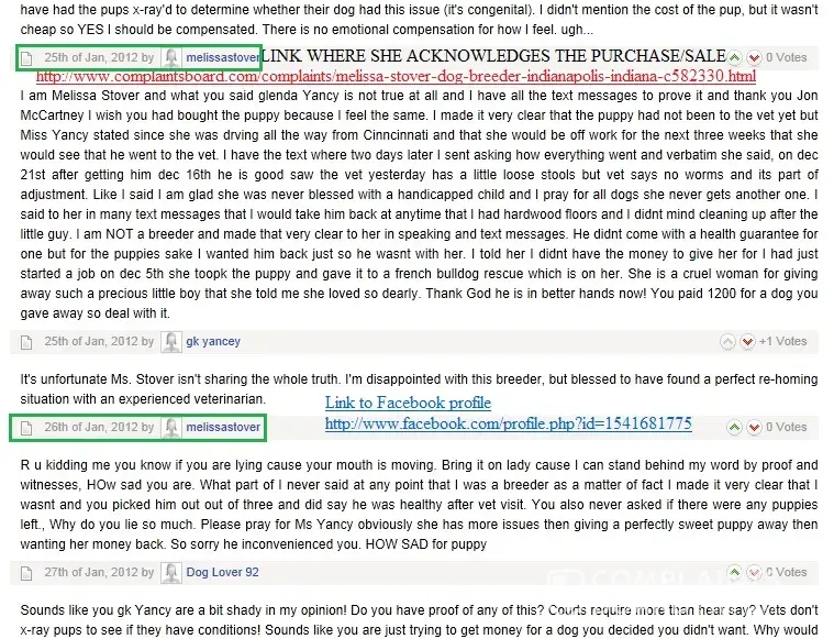 @ Jon McCartney Your faulting the buyer ? Do you blame a rape victim too ? A reputable breeder doesn't sell unvetted pups. This Melissa Stover claims she is not a breeder then where did she get 3 pups? On her Facebook profile photos she has Shar Pei not French Bulldogs. BUYER BEWARE regardless. She said she'd take pup back but could not refund money. Was there a contract between the party's ? Is there a purchase receipt ? The law is on the side of the consumer if they can prove a fraud was committed. In this case the court may say SHAME ON YOU to the buyer but that doesn't mean she can't still file complaints with all the other places I listed.
