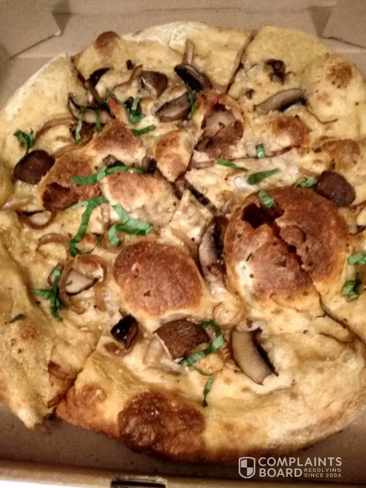 I did an online order for a vegan style pizza from Mellow Mushroom to include the ingredients spinach, caramelized portobello mushrooms, caramelized onions, garlic and olive oil. Notice the picture I took of the pizza showing just how scarce the toppings are and how the pizza crust was not prepared enough causing huge bubbles across the surface of the pizza.