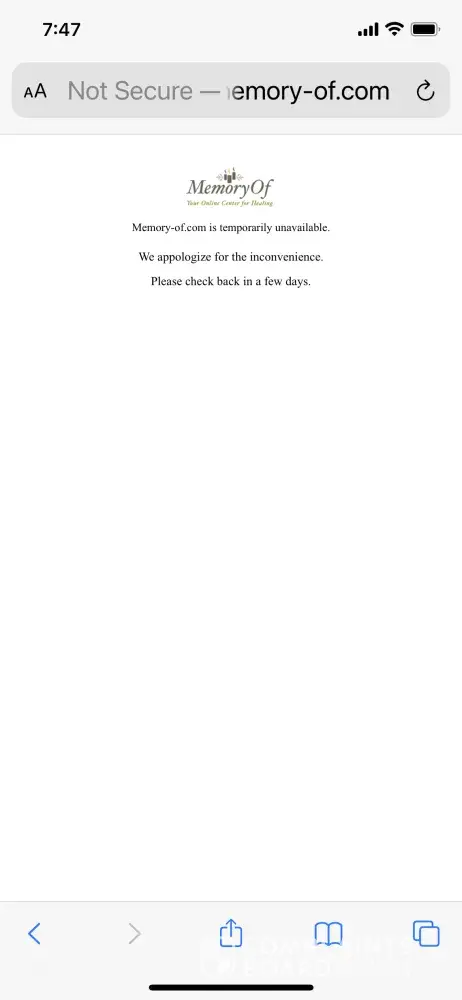 I went to the site to wish my daughter a HAPPY BIRTHDAY in heaven on August 29th but saw a message that the site was temporarily down. Since then, I have been unable to visit the site since the same message keeps popping up. I have since gone to memory-of.com and noticed several similar complaints. When I paid for my daughter's site, it was because of the ad that the site would be for life. I wanted people to know that my daughter once walked this earth and that she was a good person. I am hoping that the site is indeed temporarily offline and that it will be up and running soon.