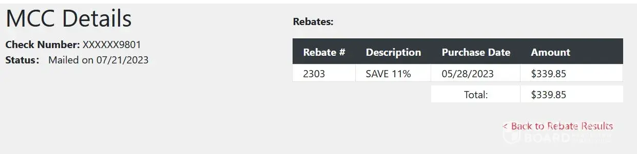 Never received any rebate. Their site says no rebates showing for me. They require you to send in your original receipt, to them by snail mail, then... nothing happens. I purchased all materials to build a Fence around property and SHOULD have gotten near to a $300 rebate and got nothing. And all they say is check the website it will show if something is in...