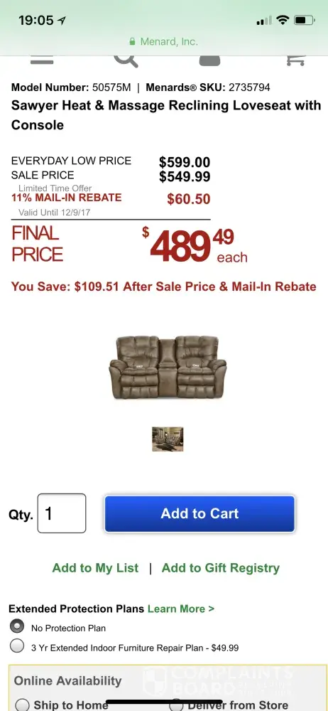 I went in store on Dec 3rd and found a dual recliner that was listed for sale price of 549.99 with an 11% rebate as well. I went back to purchase this item on Dec 9th because that was showing valid until that date for sale price. I had taken a screenshot from the Menards general website showing the price as well. On Dec 9th 2017 the price I'm store showed 599.99 with 11% rebate so Rob the general manager was shown the screenshot from Menards site and said that's not correct and accused me of photoshoping the price. I have spent thousands of dollars in this store and will no longer take my business there. For a store manager to make accusations and call me a liar to my face is unethical and he should be let go. I am writing the Better Business Bureau and placing an ad in the local and surrounding paper to show the type of people that are hired into a GM role. Truly disappointed!'