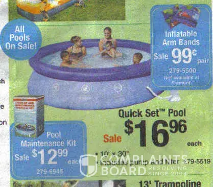On 6.14.2009 Menards nationally advertised the Quick Set Pool [protected]) for $16.96. When I went to the store, there were flyers around stating that the "...wrong price was inadvertently inserted...the price should be..$44.88." The store manager refused to sell the pool for the advertised price. He also refused to give me something in writing to the effect...
