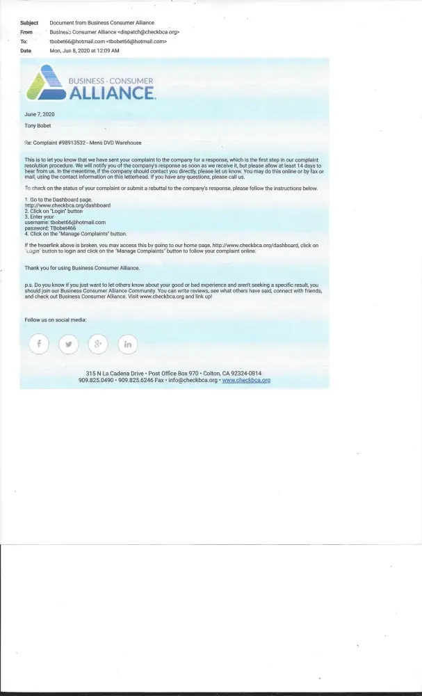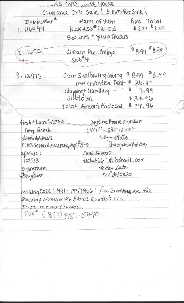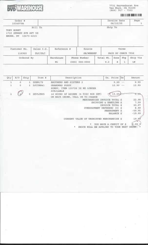 My name is Tony Bobet resided at 1710 Seward Avenue, Apt#5-G, Bronx, New York City 10473. I am file an complaint to Men's DVD Warehouse, They have two location: 25876 The Old Road Suite#311, Valencia, California 91381, 23638 Lyons Avenue, suite#465, Newhall, California 91321, I have order two separate order. From two time. First order was on May 30, 2020, and June 10, 2020. The payable by two separate Money Order that (shown below). First, order I made of three order. But, I received any two. The title of the was Cream Pie: College Slut #4, amount of $8.99. However, I received an Money Order of $9.02 on June 15, 2020. Now, I have some problem with another order. The second order is much different. There is two item that I didn't received. the name of the items, 16 Hours of Asians (4 Disc Box Set), the amount of $19.99, and the other item, Grandma Get Nailed # 5, $14.99. And, I file an complaint to Alliance and the person who took my case, Her name is Kim Burge.