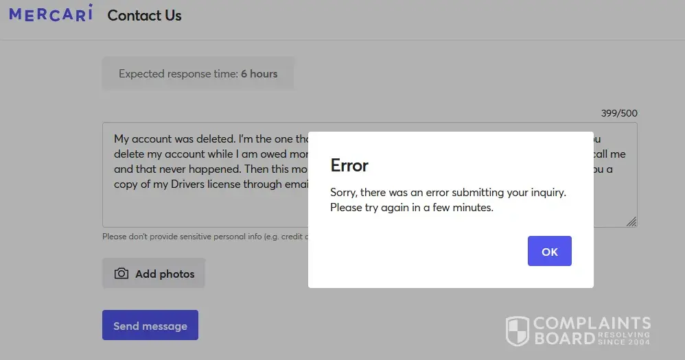 Last week I contacted them about not being able to transfer my balance from Mercari into my bank account because they would not accept a photo of my driver's license I was trying to upload. After 15 minutes of being on the phone with them, no resolution was made. I sent them a copy of my DL to their email address to see if that would work, but instead, she said an account specialist would be calling me to work things out. I never received a call. Instead, my account was deleted in the middle of the night on a Friday. Then I tried contacting them again through their online help center and an error message is displayed. So basically, they have stolen my money. This is ridiculous. They will be hearing from my fiance who is an attorney.