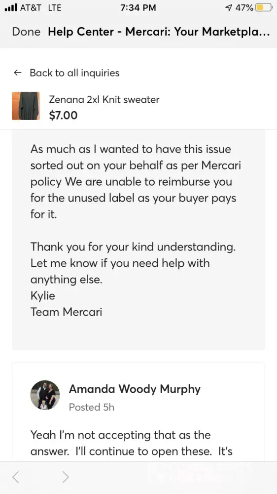 Desired outcome: Mercari reimbursed me for my product.