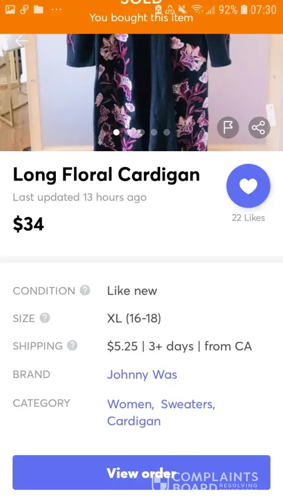 I purchased an item on mercari on 11/09/2019. Item was listed as brand: "Johny Was ". However I received a different brand which is of a cheaper material. I feel like I was tricked by the seller ( who lied about the brand) into buying a product. Seller didn't make any mention of the real brand of the item. The item brand is "style & co " but they listed it as "Johnny was" (which is what I thought I was buying). The item was received on 11/13/2019 and I filed a return claim with Mervari the same day. Mercari answered me saying that the item cannot be returned. I am very checked to see that this app is actually encouraging scammers. I checked the reviews of the seller I purchased the item from and I noticed that this was not her first attempt to scam buyers. She previously listed items with brands (more expensive) that were in reality different from the actual item brand (cheaper). for instance the brand "free people" is not the same as "forever 21". This seller is a true scammer and not only she should be banned from selling on Mercari, but surprisingly Mercari is encouraging her to scam innocent buyers. the policy of mercari says that the item description has to be as specific as possible especially when you list the brand, because that's what buyers look for in filters. I though I purchased a "Johny was" cardigan but I received a "Style &Co" instead. And Mercari sided with the scammer and took my money. I paid $34 plus $5.25 shipping. in addition to that the item looks old and wellworn. with lots of white spots on it. I cannot clean all of that. and there's a piece of thread coming out.