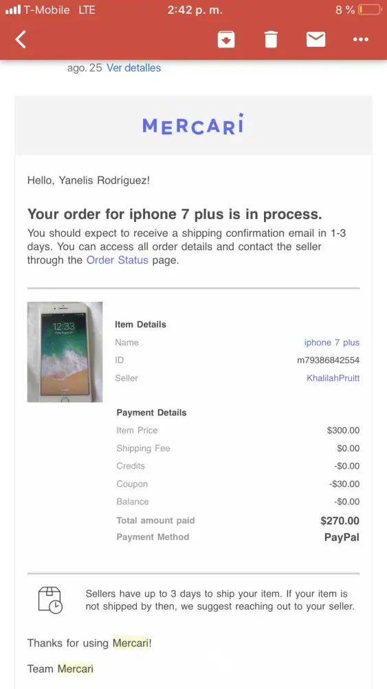 good afternoon I'm saying that this person made a purchase of a cell phone, and the order has never come to me anymore Paypal is charging me that money, I need you to please solve that problem, because I cheated and set aside an additional 90 dollars