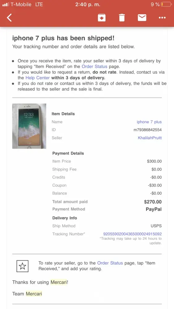 I ordered a phone from this website but when I received it, the package was already opened and badly packed. When I looked at the phone it was cracked badly. After the 3 days the seller stopped responding. I want a refund. I made a case with my credit card company and they gave em the money back temporally but it needs mercari to respond. This all happened in october 27th. I provide pictures of the shipping delivery address, phone, and the message between me and the seller.