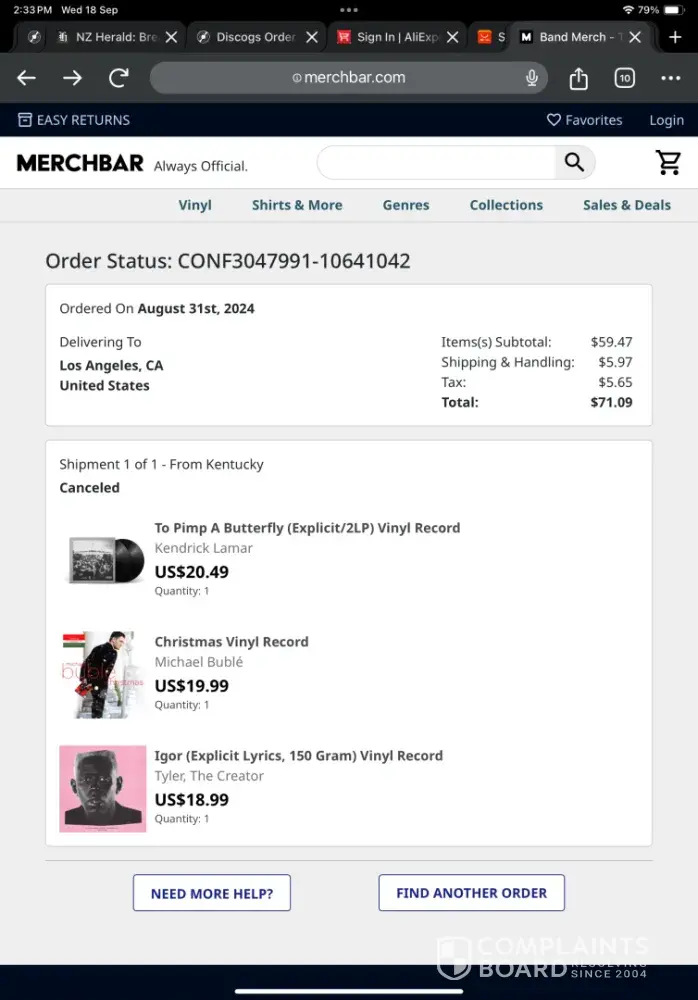 On November 30, I placed an order with Merchbar for one Ice Nine Kills, The Silver Scream 2: Welcome to Horrorwood 'Love Hurts' Variant LP Vinyl album and one Ice Nine Kills sticker pack. These are products from the band Ice Nine Kills that are sold through Merchbar and were intended as a Christmas gift for my son. I received a confirmation email with Order# CONF5933509-5889793. The confirmation email also included a link where I could check the status of my order.