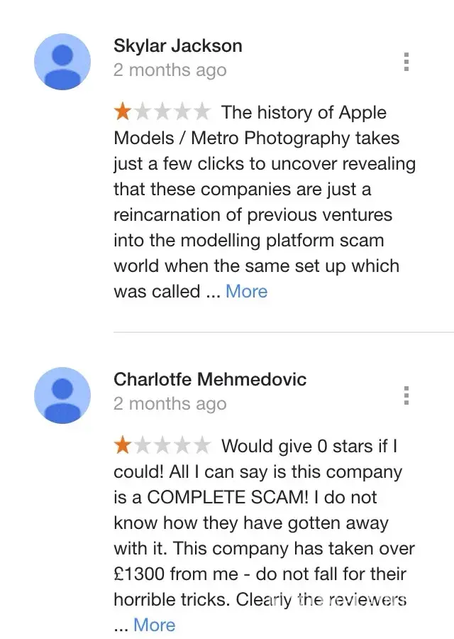 Reviewer13781-Apple and Metro have a wonderful and convincing way of making you believe what they say is real and that you will be a model! I think a lot of people who have had this experience are really very angry I know I am and I will be doing what I can to prevent them from doing this to people. Please message me if you would like to do more. Good luck in your pursuit to be a model xx