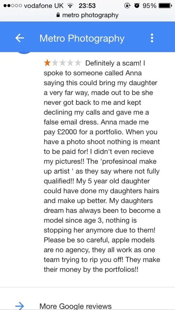 Please watchout for modelling egency, apple modelling agency, offering you a chance to go and have a photographic shoot with metro photography in london. . . It is a scam. Once you get there they will not let you wait inside the studio if you are abit early, they will tell you to come back at the right time, and whilst you are outside, they go through your...