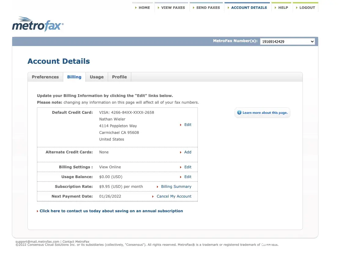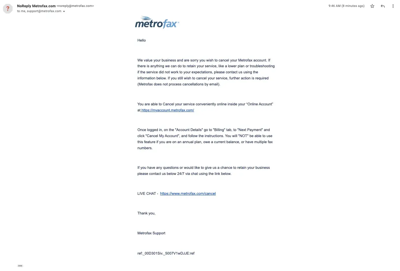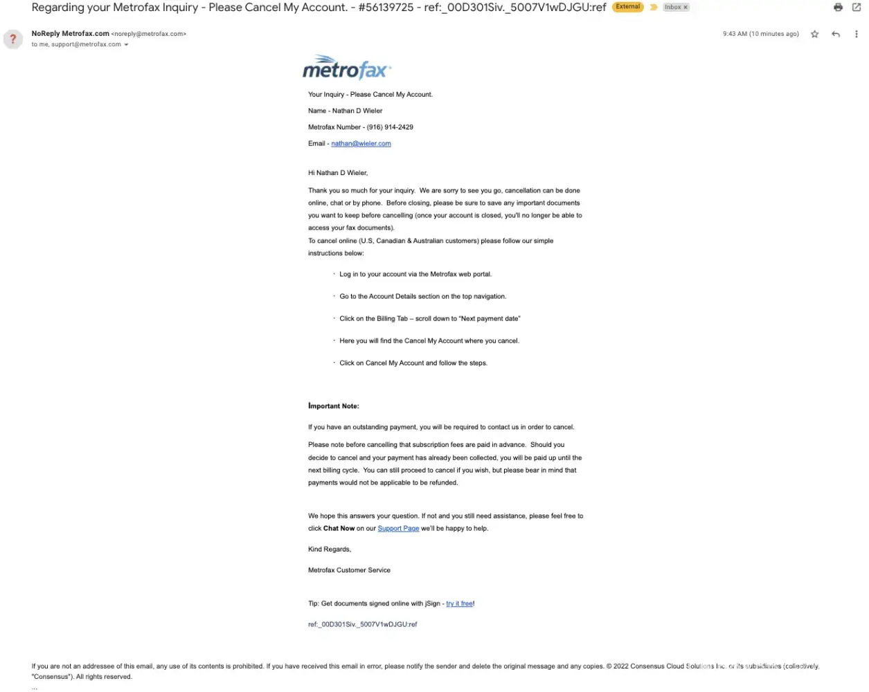 Later I got another bill from MetroFax. I sent them another message, asked them to cancel my account and stop taking my money, and nothing again! They continued to ignore me and charged me every month.