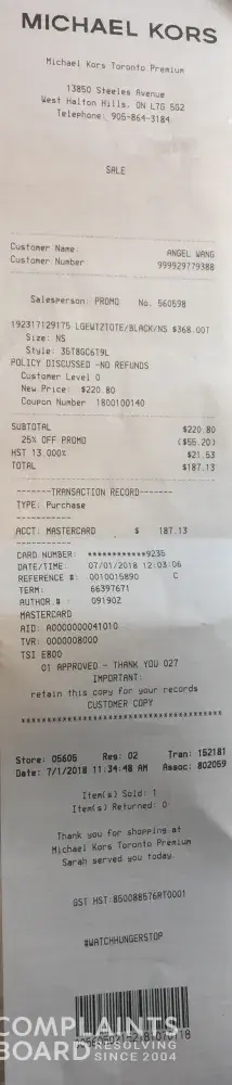I purchased a bag last week at the Toronto premium outlet store at 13850 Halton Hills and was given the wrong bag by the cashier. Afterwards I was given a return label from MK and I shipped it through Fedex last Friday. Before this everything was good. But now It's been a week and I haven't received anything. This week I called the store 3 times and everytime I was told to wait for a callback but they never did. Now I have spoken to more than 3 staffs and got the same answer. I was pretty angry in the first place that I was given the wrong bag. Now the service is even worse.