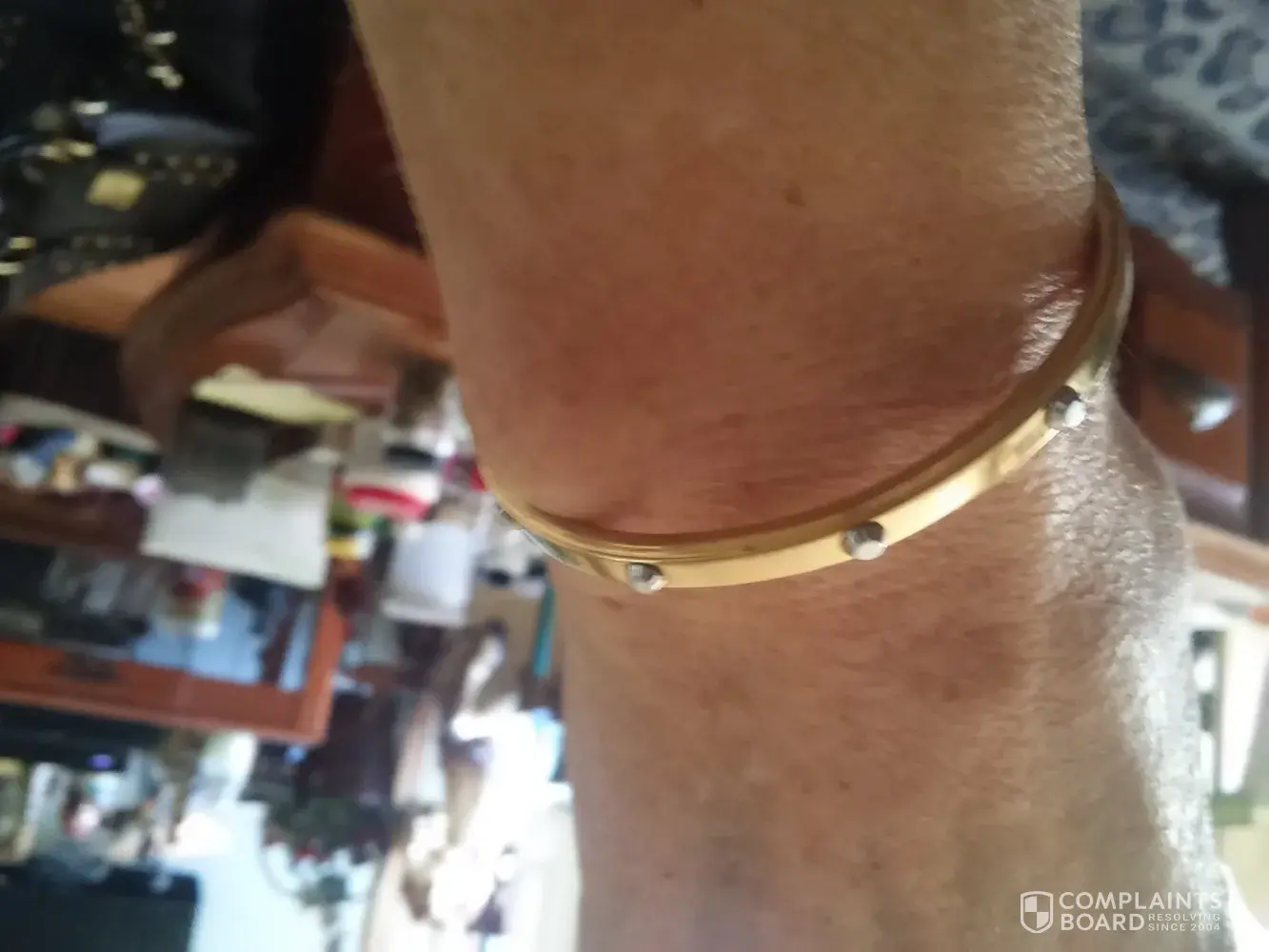 Gold tone bracelet with silver tone studs surrounding it. One of the studs feel off. It is less than one year old and has only been worn approximately 10 times before this happened. I have not abused the bracelet and it was rather expensive. I am willing to pay for repairs due to the fact that I no longer have the receipt. I have purchased two of your handbags and they required registration but the bracelet did not.