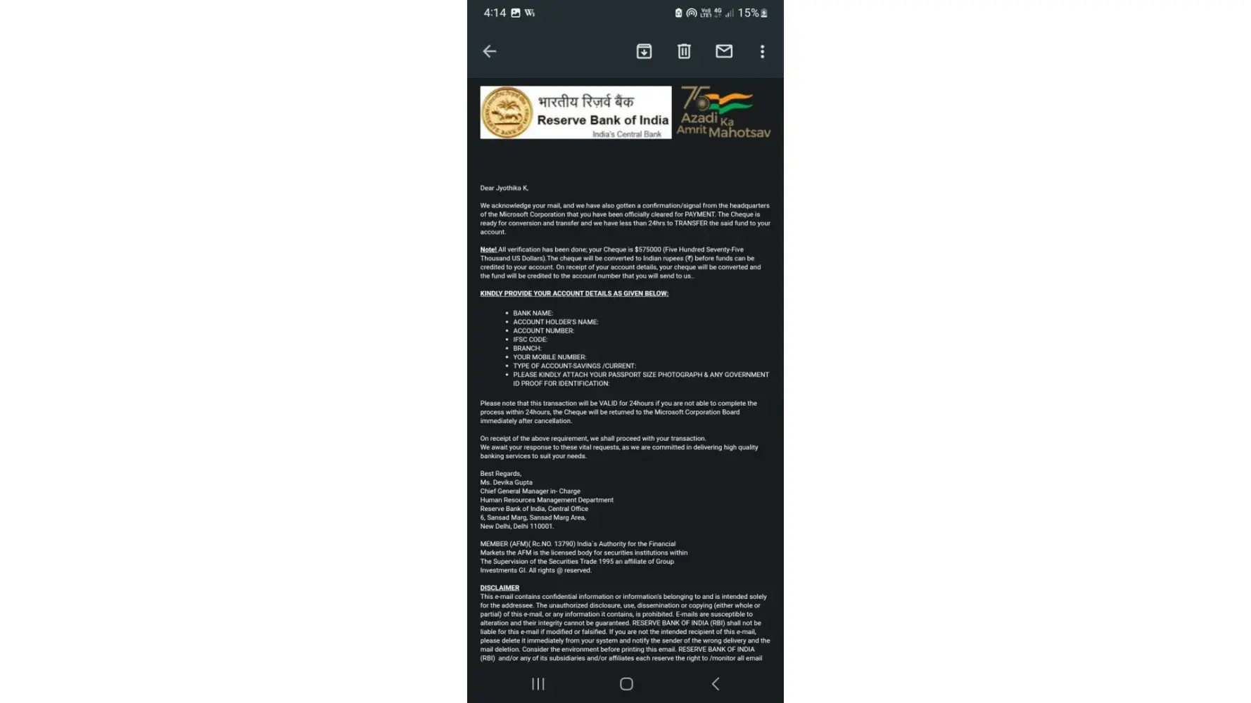 Please note: If you which to receive your fund $575000 (five hundred seventy-five thousand United States dollar) through the Reserve Bank of India (RBI) must fill in the form provided and send it to the Reserve Bank of India (RBI) Email: [protected]@rbitransfer.org.in