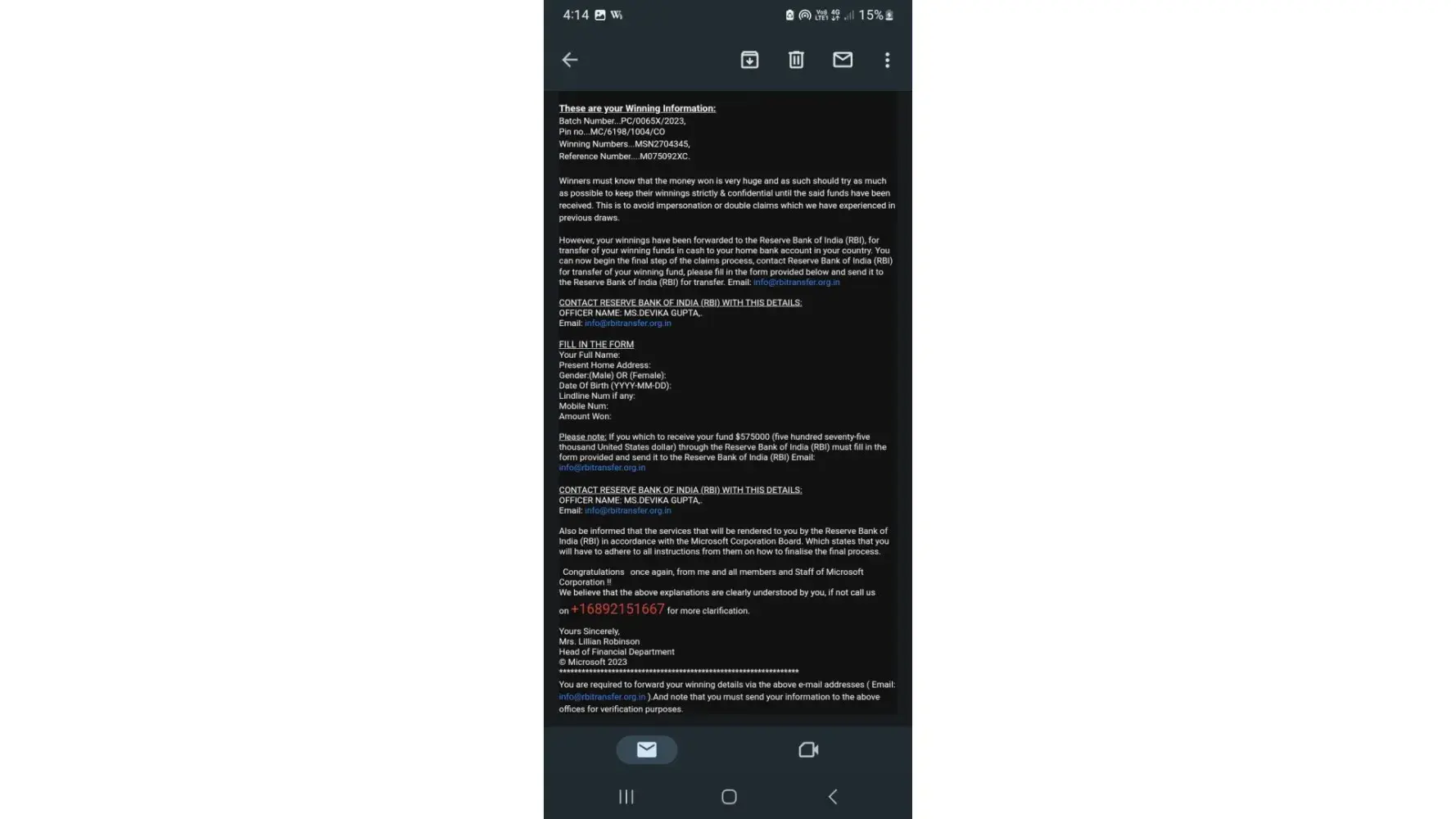 However, your winnings have been forwarded to the Reserve Bank of India (RBI), for transfer of your winning funds in cash to your home bank account in your country. You can now begin the final step of the claims process, contact Reserve Bank of India (RBI) for transfer of your winning fund, please fill in the form provided below and send it to the Reserve Bank of India (RBI) for transfer. Email: [protected]@rbitransfer.org.in