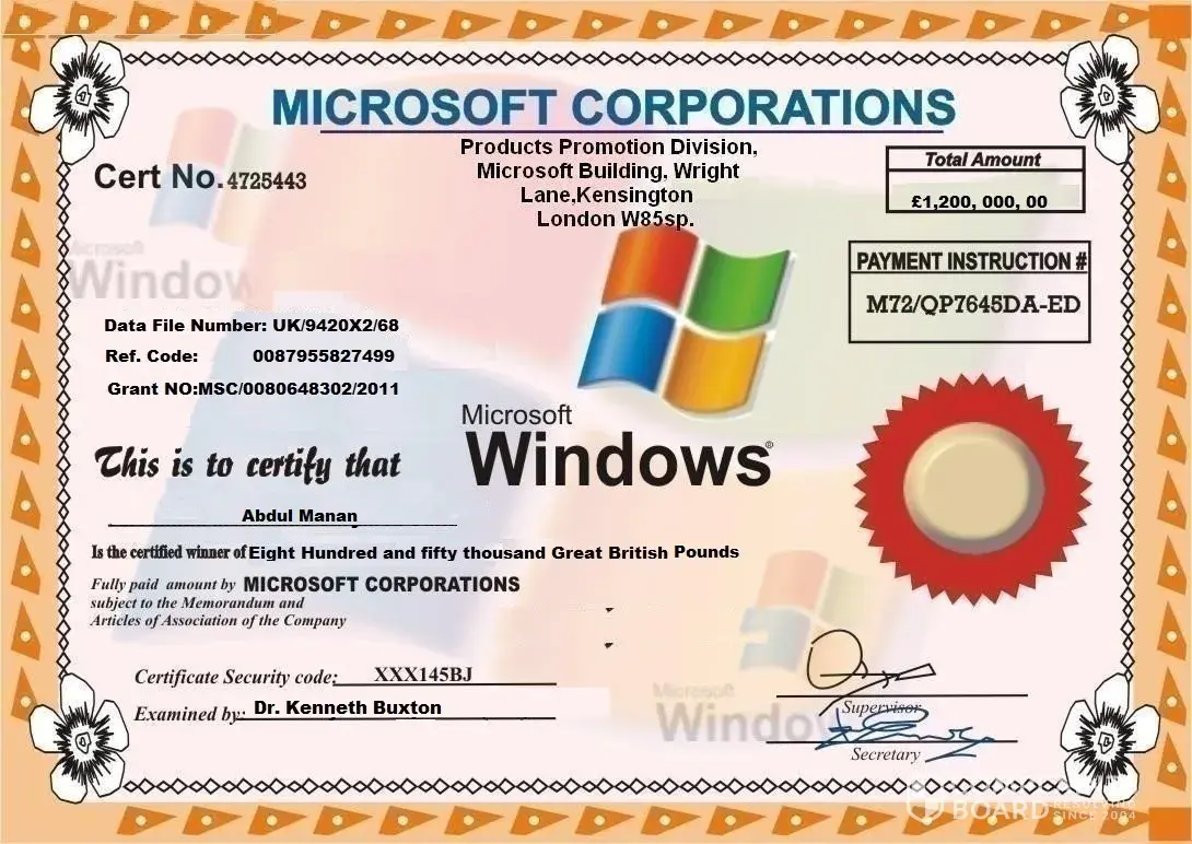 A Cheque will be issued in your name by Microsoft Corporation Board UK (MCSP), you have therefore won the entire sum of £1, 200, 000, 00(One Million Two Hundred thousand Great British Pounds Sterling) which consequently won in the 2nd category.