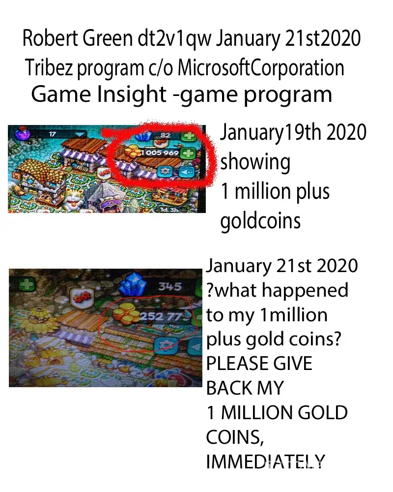 ps in reference to just sent 1 million gold coins STOLEN FROM ME, BY YOUR PROGRAM-EMAIL COMPLIANT- ice-marble fjord[island], mystery shore [desert island], -where I was planning to buy-build a 1 million gold coin "OBSERVATION TOWER" SOON-WITHIN10-20 DAYS BY JANUARY 30TH 2020.[IN REFERENCE TO:sunday, January 19th 2020 I had over 1, 110, xxx plus gold coins that I was planning to buy an 1million gold coins observation tower for the desert island or the ice marble something island, but I still needed 2000 cut marble and 2500 yellow dust. today January 21st 2020 Tuesday, the 1 million gold coins is not there. WHY?..WHAT KIND OFA CRIMINAL SCAM ARE YOU RUNNING? THAT YOUR PROGRAM STEALS 1 MILLION GOLD COINS FROM YOUR USERS!...I WANT MY1 MILLION GOLDCOINS BACK, IMMEDIATELY..THANK YOU.]